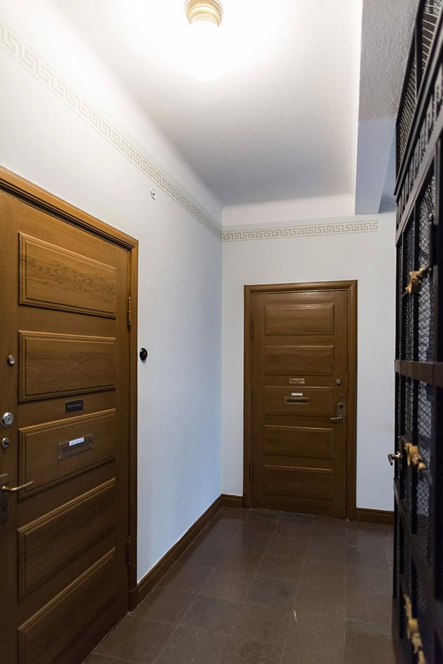 På Grev Magnigatan 8 har vi dekorationsmålat entrén och målat om övriga ytor i trapphuset.